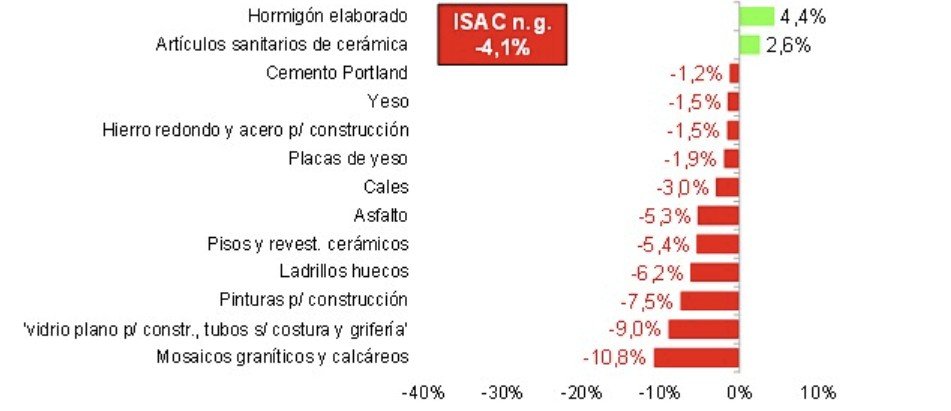 Los envíos a plaza de hormigón elaborado registraron una mejora de 4,4% mensual desestacionalizada y los de artículos sanitarios de cerámica hicieron lo propio a un ritmo de 2,6%. Del otro lado, la menor caída correspondió al cemento Portland, el termómetro de la actividad de la construcción debido a su condición de perecedero, con 1,2% mensual, y fue seguido por el yeso y el hierro redondo y el acero para construcción, con bajas de 1,5% mensual cada uno, las placas de yeso (-1,9%), las cales (-3,0%), el asfalto (-5,3%), los pisos y revestimientos cerámicos (-5,4%), los ladrillos huecos (-6,2%), las pinturas para construcción (-7,5%), el agregado ‘‘vidrio plano para construcción, tubos sin costura y grifería’ (-9,0%) y los mosaicos graníticos y calcáreos (-10,8%).