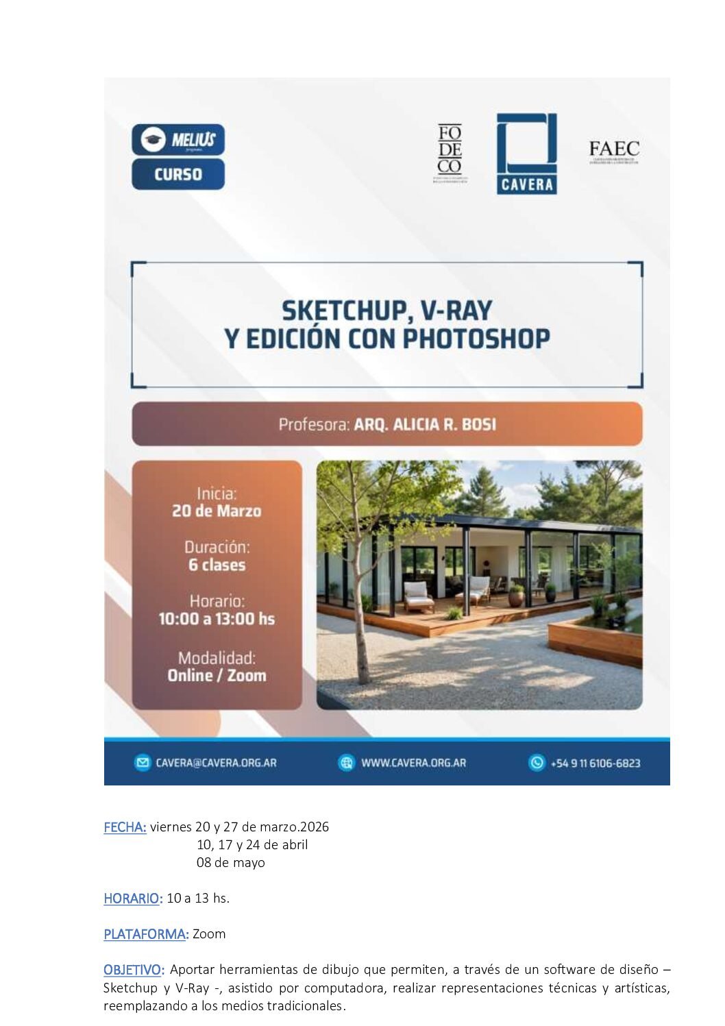 *Se proporcionará el software Sketchup – V-Ray – Photoshop DOCENTE: ARQ. ALICIA BOSI