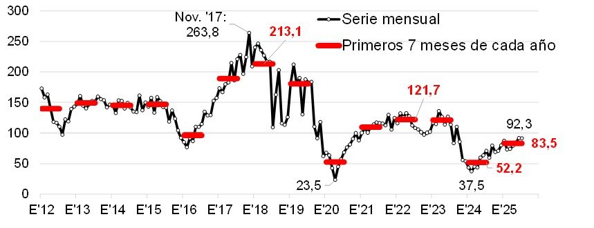 En línea con la evolución de las partidas relacionadas con la cuenta de transporte, los despachos al mercado interno de asfalto experimentaron un rebote con relación al piso que marcaron durante 2024 (el cual fue incluso inferior al promedio de enero-julio de 2020), pero continuaron siendo muy inferiores a los registrados hasta 2023. La serie mensual mostró que la recuperación comenzó en marzo del año pasado, pero la velocidad del proceso fue muy baja. Por ello, mientras las entregas de asfalto registradas en enero-julio de 2025 fueron 59,9% mayores a las de enero-julio de 2024, al compararlas con los promedios de los primeros siete meses de 2022 y 2023 todavía resultaron 30,9% inferiores, y si se contrastan con el máximo alcanzado en el mismo lapso de 2018, fueron 60,8% menores.