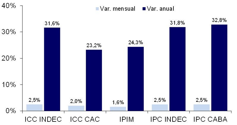 La apertura del capítulo materiales del ICC-INDEC mostró que las principales subas mensuales se verificaron en: muebles de madera para cocina (6,9%), pinturas y afines (2,6%), ladrillos y otros productos cerámicos (2,2%), aberturas metálicas y rejas (2,1%), piezas de carpintería (1,9%), griferías y llaves de paso (1,6%), maderas en bruto y madera para techos y pisos (1,5%) y equipos para incendio (1,5%). Y los menores incrementos correspondieron a: artefactos a gas (0,7%), hierro para la construcción (0,6%), productos de hormigón y cemento (0,6%), electrobombas (0,5%), vidrios (0,5%), artefactos de iluminación y portero eléctrico (0,3%), mesadas de granito (0,2%) y ascensores (-0,3%).