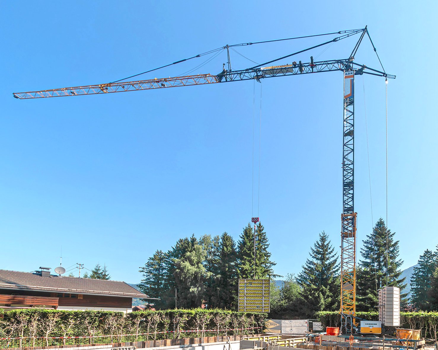 Ciertamente, la nueva Liebherr 43K puede ser la única grúa en la ejecución de viviendas, porque es un equipo compacto de montaje rápido que se encarga de todas las operaciones de elevación y movimiento de materiales de construcción, ofreciendo un rendimiento preciso aun en obradores con espacio limitado, gracias a sus sistemas de asistencia de última generación Sway Control Plus (control de balanceo), Guided Hook (gancho guiado), Vertical Line Finder (buscador de línea vertical) y Positioning Pilot (Piloto de Posicionamiento).