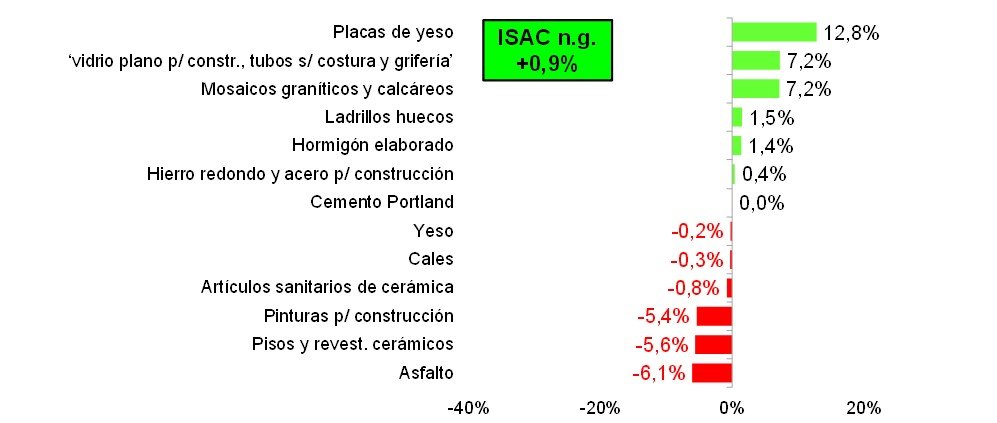 Por su parte, la desagregación del ISAC por insumos mostró comportamientos muy disímiles entre ellos entre agosto y septiembre. Mientras que se registraron mayores despachos de seis grupos de insumos, el termómetro de la actividad sectorial -el cemento Portland- se mantuvo en el mismo nivel del mes anterior y del otro lado se ubicaron otros seis grupos de insumos. Las mayores entregas correspondieron a placas de yeso, el agregado ‘vidrio plano para construcción, tubos sin costura y grifería’, mosaicos graníticos y calcáreos, ladrillos huecos, hormigón elaborado y hierro redondo y acero para construcción, las que resultaron entre 12,8% y 0,4% mayores a las de agosto. En tanto, hubo menores envíos a plaza de yeso, cales, artículos sanitarios de cerámica, pinturas para construcción, pisos y revestimientos cerámicos, y asfalto, con caídas que fueron de 0,2% a 6,1%.